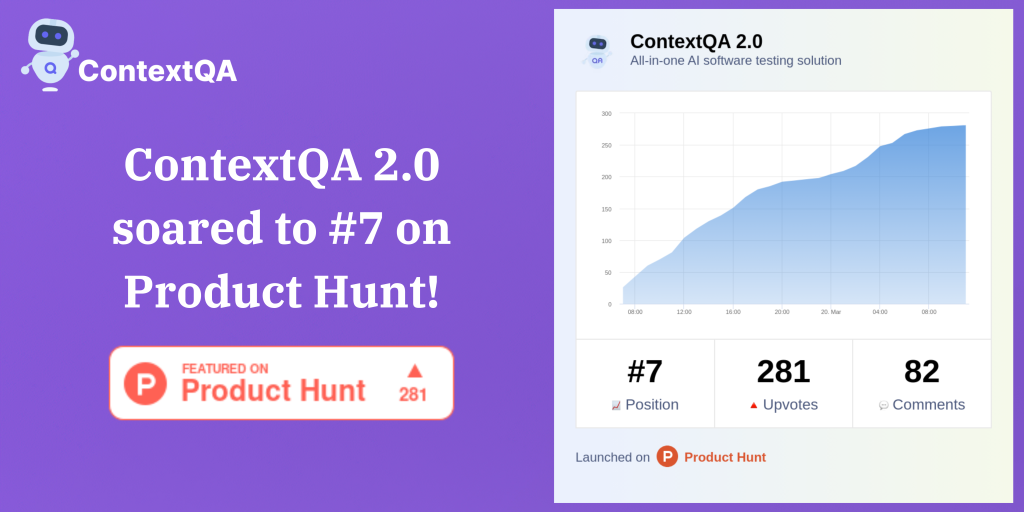 ContextQA 2.0 dominated the charts during its launch day. It’s no mean feat to achieve a day ranking of #7 on Product Hunt.